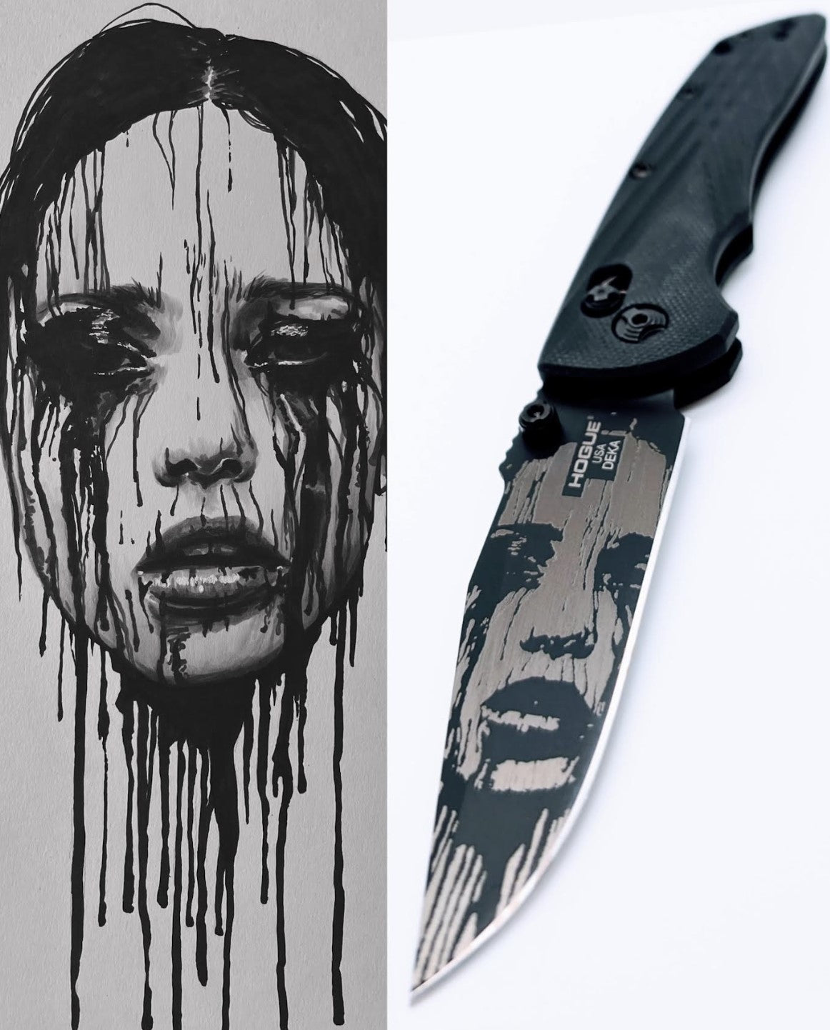 Featuring three laser engravings on the USA-made Hogue Deka platform, "Pain is Beauty" is highlighted by the penetrating gaze of a tortured soul on the primary face of the CPM-20CV steel.